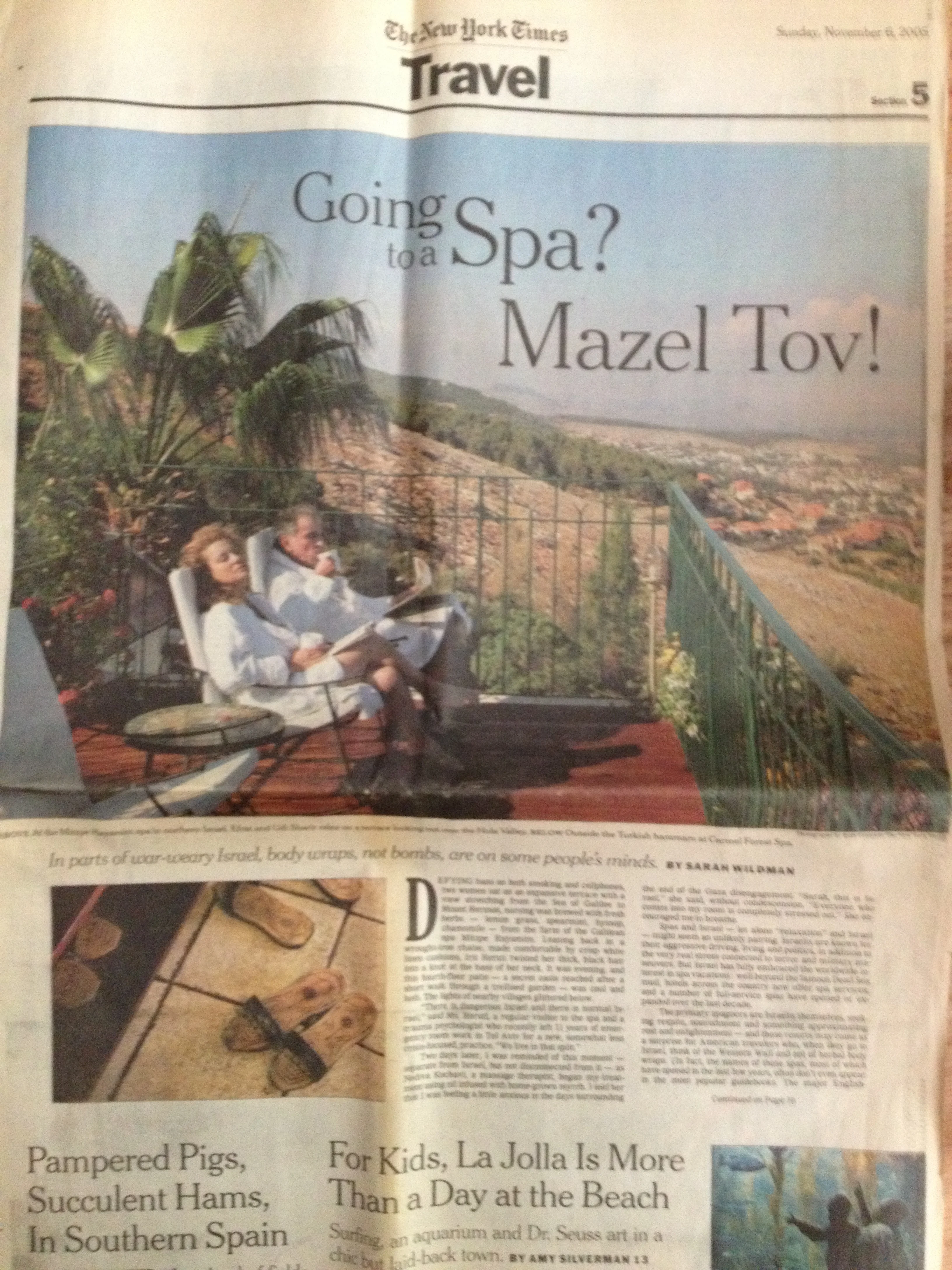 The drive to our next and final stop, the Carmel Forest Spa (Yaarot Hacarmel) brought us on a relatively short, if perilous, climb into the Carmel Forest Mountains to a complex that is cut into the mountain, giving many of its rooms views of the valley below. As Irit Heruti said to me earlier, you are either a Mitzpe Hayamim person or a Yaarot Hacarmel person. Arriving in the hushed halls with signs everywhere warning that children under 16 were not permitted, I understood why. You could be in Palm Springs or the Berkshires; there is less here that says Israel, other than the language.