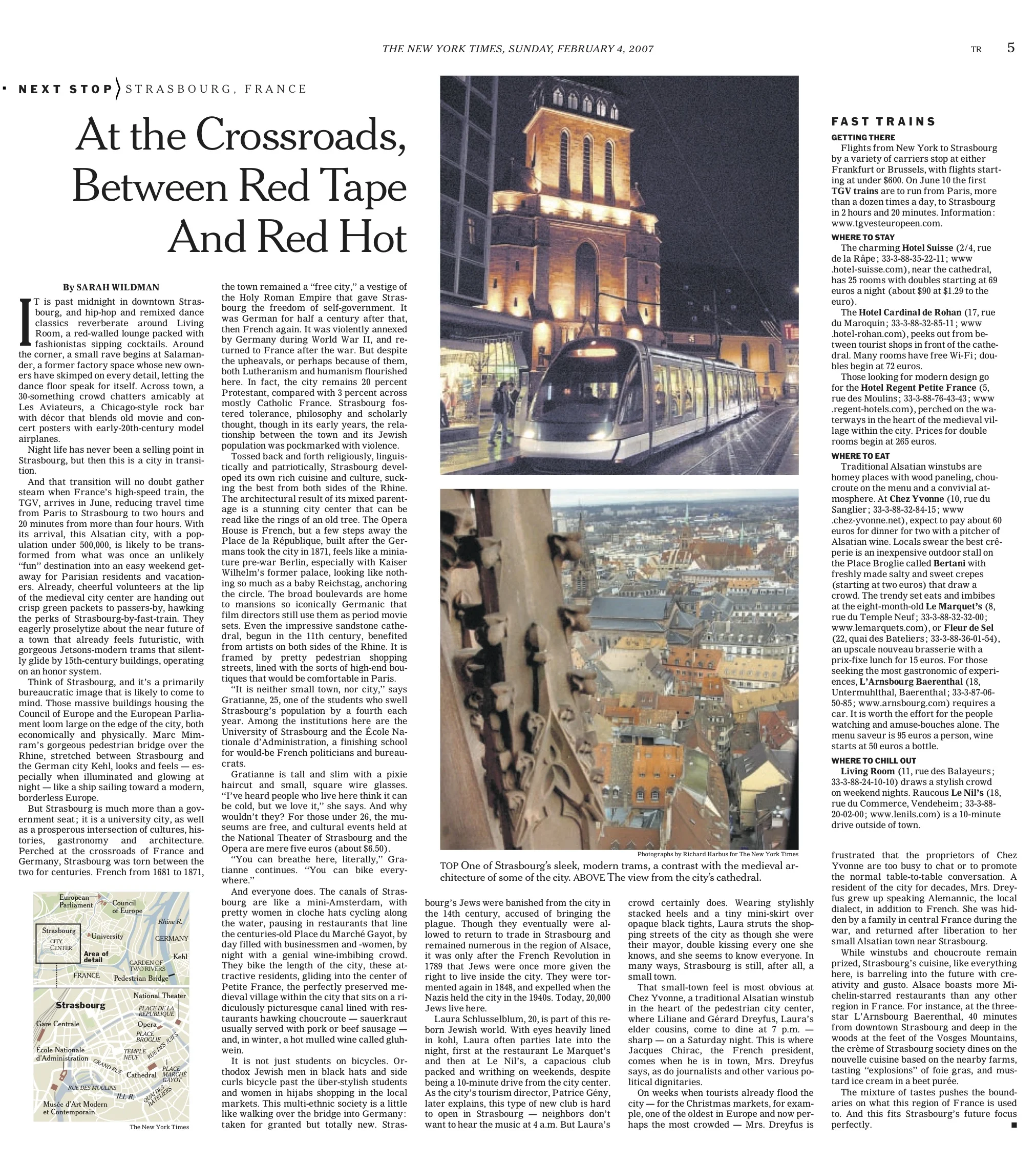 Traditional Alsatian winstubs are homey places with wood paneling, choucroute on the menu and a convivial atmosphere. At Chez Yvonne (10, rue du Sanglier; 33-3-88-32-84-15; www.chez-yvonne.net), expect to pay about 60 euros for dinner for two with a pitcher of Alsatian wine. Locals swear the best crêperie is an inexpensive outdoor stall on the Place Broglie called Bertani with freshly made salty and sweet crepes (starting at two euros) that draw a crowd. The trendy set eats and imbibes at the eight-month-old Le Marquet's (8, rue du Temple Neuf; 33-3-88-32-32-00; www.lemarquets.com), or Fleur de Sel (22, quai des Bateliers; 33-3-88-36-01-54), an upscale nouveau brasserie with a prix-fixe lunch for 15 euros. For those seeking the most gastronomic of experiences, L'Arnsbourg Baerenthal(18, Untermuhlthal, Baerenthal; 33-3-87-06-50-85; www.arnsbourg.com) requires a car. It is worth the effort for the people watching and amuse-bouches alone. The menu saveur is 95 euros a person, wine starts at 50 euros a bottle.